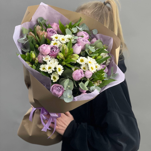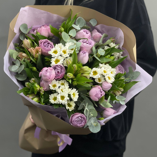 Букет "Парадайз" из кустовых пионовидных роз, альстромерий и хризантем сантини