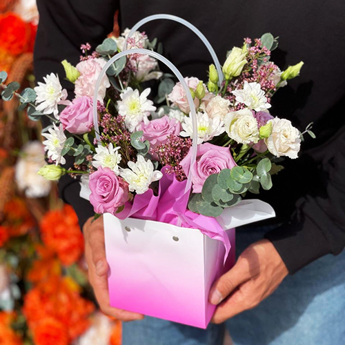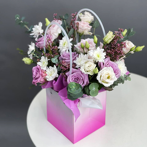 Стильная композиция в сумочке из роз, хризантем и эустом