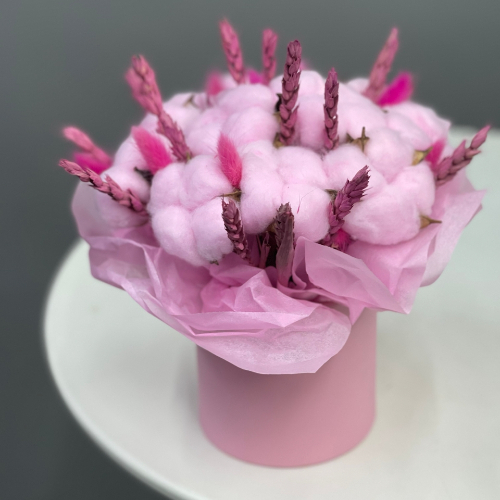 Композиция в шляпной коробке мини из хлопка, пшеницы и лагуруса